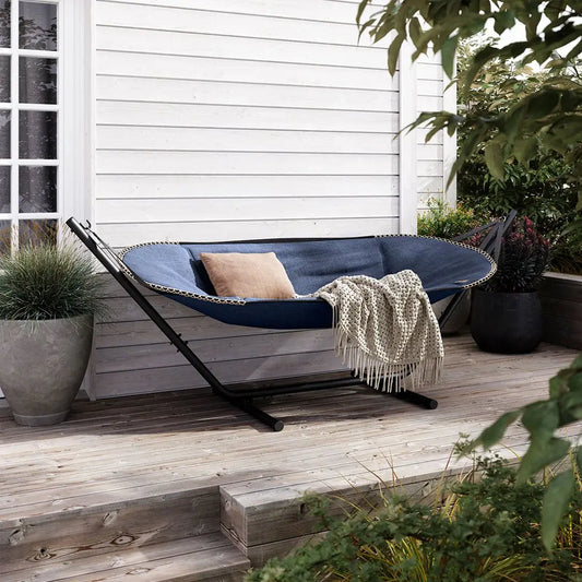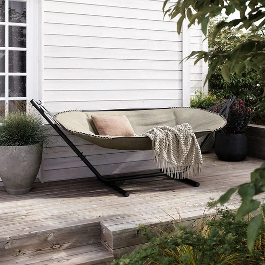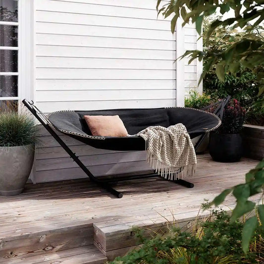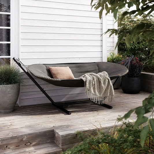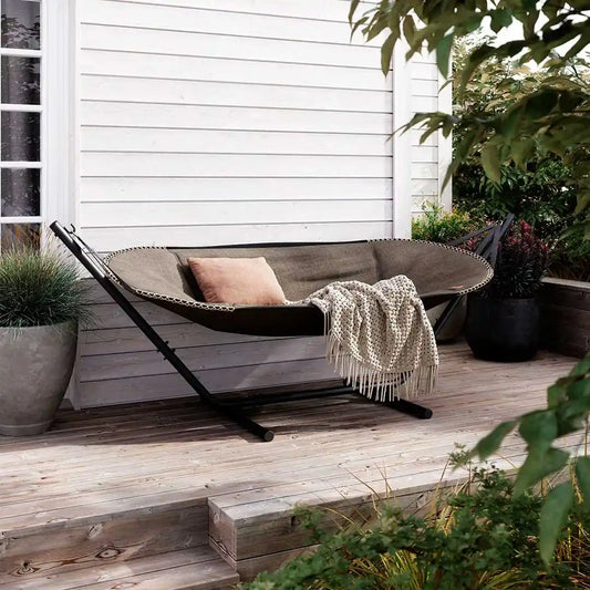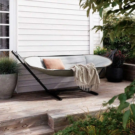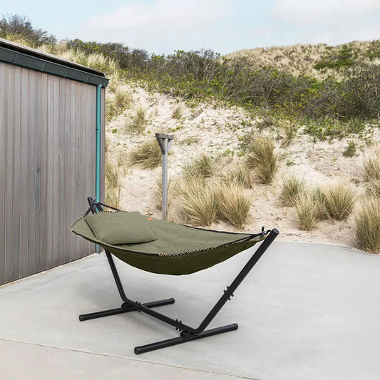 Det solide aluminiumstativ er designet til at tåle vind og vejr og kan stå ude året rundt. Flyt nemt din hængekøje, så du altid kan vælge sol eller skygge – afslapningen er sikret.